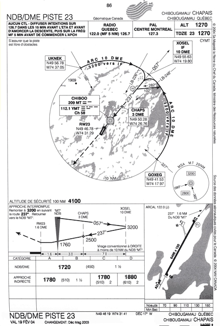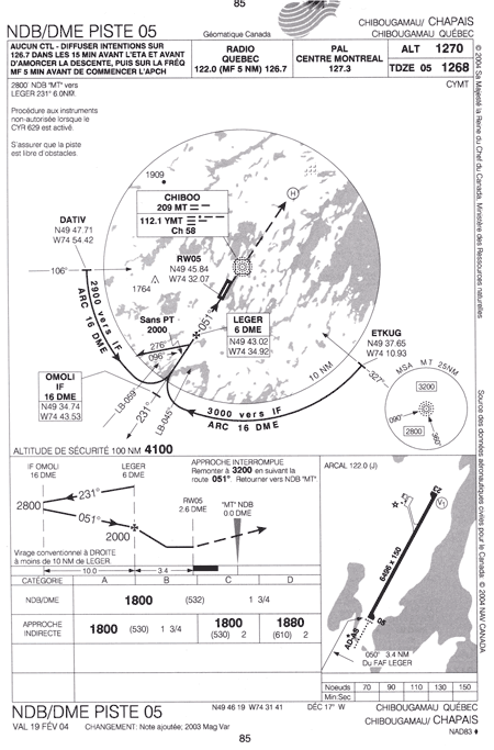 L'altitude minimale de descente (MDA) publiée pour l'approche NDB/DME de la piste 05 est établie à 1800 pieds asl, soit 532 pieds au-dessus du sol et la visibilité est établie à 1 ¾ mille. Même si le plafond était inférieur au minimum publié pour une approche aux instruments pendant l'approche, aucun règlement n'interdisait l'équipage de conduite d'effectuer l'approche. Quant à l'atterrissage, la réglementation en vigueur interdit au pilote d'un aéronef en approche aux instruments de poursuivre la descente en dessous de la MDA s'il n'a pas établi et maintenu la référence visuelle requise à l'exécution d'un atterrissage en toute sécurité. Dans un tel cas, il doit alors effectuer une remise des gaz.