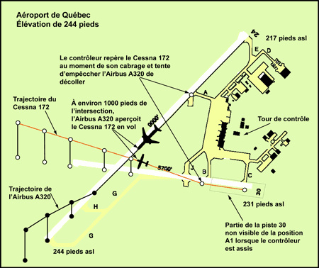 L'aéroport de Québec est un aéroport contrôlé qui possède deux pistes : la piste 06/24 qui mesure 9000 pieds de longueur sur 150 pieds de largeur, et la piste 12/30 qui mesure 5700 pieds de longueur sur 150 pieds de largeur. Les pistes se croisent à 5800 pieds du seuil de la piste 24 et à 4300 pieds du seuil de la piste 30. Parce que les installations aéroportuaires se situent entre les deux pistes, un pilote qui se trouve sur la piste 24 ne peut voir le seuil de la piste 30 que lorsque son appareil est à environ 2900 pieds du seuil de la piste 24.