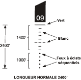 | Balisage lumineux | Dispositif lumineux simplifié d'approche de précision à feux indicateurs d'alignement de piste (SSALR) : | Balisage lumineux d'approche à haute intensité (ALSF-2) : |
