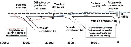 Au toucher des roues, l'avion avait un cap de 117° M. Le train d'atterrissage principal droit s'est posé en premier, environ à 8 pieds à l'extérieur du bord gauche de la piste et à 2700 pieds au-delà du seuil. La trace initiale laissée par le train principal dans la neige suivait un cap approximatif de 109° M. Peu après le toucher des roues, l'inversion de poussée est entrée en action, accompagnée d'un important mouvement de lacet à droite. Les traces laissées par l'avion dans la neige témoignaient d'un dérapage latéral, lequel a atteint une valeur de 23° à droite par rapport à la trajectoire de l'avion. Grâce à ces mesures correctives prises par l'équipage de conduite, l'avion a pu regagner la piste après avoir parcouru 1600 pieds à côté de celle-ci et avoir traversé la voie de circulation A2. L'avion s'est immobilisé dans l'axe de la piste, 4550 pieds au-delà du seuil (voir la figure 1). Au moment du toucher des roues, la RVR de la piste 12 était de 1200 pieds, et celle de la piste 30 était de 800 pieds.