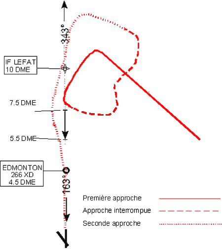 Lors de la préparation de la première approche à Edmonton, l'équipage a d'abord réglé le sélecteur de route de l'EHSI sur 343 °M, cap approprié à l'approche alignement arrière de la piste 16. Il s'attendait à voir apparaître l'indicateur B/C sur l'EHSI, ce qu'il aurait interprété comme un bon réglage du sélecteur de route pour un alignement arrière. Cette indication n'apparaissant pas, il a affiché 163 °M, et le voyant s'est allumé. Pendant le virage à gauche, après le passage au cap de 268 °M pendant l'interception de l'alignement de piste, l'indicateur B/C a dû s'éteindre mais, concentré sur l'approche, l'équipage ne s'en est pas rendu compte. Comme il ne connaissait pas très bien l'EFIS installé récemment, l'équipage a effectué les approches à CYXD alors que le sélecteur de route était mal réglé.
