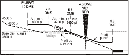 Pendant l'approche, le commandant de bord a signalé que l'avion était à 4,7 nm DME (équipement de mesure de distance) alors que l'appareil se trouvait en réalité à 10 nm de l'aéroport, car il avait lu la distance jusqu'au repère d'approche finale affichée sur le système de positionnement mondial (GPS) plutôt que la distance affichée sur le DME. Les données radar ont montré que l'avion est descendu jusqu'à environ 3500 pieds, soit 800 pieds au-dessous de l'altitude minimale de descente par paliers fixée à 4300 pieds, avant de descendre sous la base des nuages. (Voir la figure 2 de l'annexe A.)