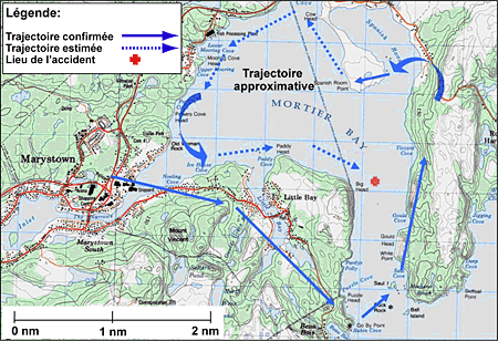 Lorsque l'hélicoptère a quitté Go By Point pour revenir à Marystown, il n'y avait que de légères chutes de neige. Il semble que les conditions météo empêchaient d'effectuer un vol direct vers Marystown et que le pilote ait décidé de suivre une route un peu plus longue en suivant la rive nord de la baie Mortier (voir l'annexe A). Toutefois, l'hélicoptère aurait graduellement fait face à de plus fortes chutes de neige à mesure qu'il se dirigeait vers le nord, puis vers l'ouest en direction de Marystown. Une fois établi sur un cap à l'ouest vers Marystown, il aurait été difficile de faire demi-tour en raison de la visibilité très réduite car un virage à droite aurait amené l'hélicoptère vers un relief qui s'élève rapidement avec le risque de se retrouver dans des conditions de voile blanc. Un virage à gauche aurait amené l'hélicoptère au-dessus de l'eau et aurait fait perdre au pilote tout contact visuel avec la côte.