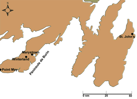 La carte météorologique de prévision de zone graphique (GFA)Note de bas de page 1 pour l'Atlantique, publiée à 7 h 51, heure normale de Terre-Neuve (HNT)Note de bas de page 2, donnait les prévisions suivantes pour la péninsule de Burin (Terre-Neuve-et-Labrador) : plafonds à 2500 pieds au-dessus du niveau de la mer (asl), visibilité de 2 à 6 milles terrestres (sm) dans de légères averses de neige accompagnées de poches éparses de stratocumulus donnant des plafonds de 400 pieds asl et des visibilités de ½ sm dans la neige. Les prévisions annonçaient des vents de l'ouest soufflant en rafales à 30 nœuds.