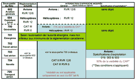 Ces modifications sont entrées en vigueur le 1er décembre 2006 et elles visent les exploitants commerciaux. Les modifications les plus importantes à l'interdiction d'approche touchent les exploitants commerciaux possédant un certificat d'exploitation aérienne relevant des sous-parties 702, 703, 704 et 705 du Règlement de l'aviation canadien (RAC) qui utilisent des avions selon les règles de vol aux instruments (IFR). De petites modifications s'appliquent aux opérations d'hélicoptères commerciaux en IFR ainsi qu'aux opérations d'aéronefs en IFR menées par des exploitants privés ou par l'aviation générale.