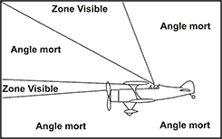 Les deux biplans étaient très maniables et disposaient d'une puissance amplement suffisante pour le numéro de voltige prévu. Tous les aéronefs ont des limites de conception qui réduisent la visibilité du pilote. Comme l'aile supérieure des biplans est montée en avant et au-dessus du pilote, elle crée un important angle mort supplémentaire dans le champ de vision du pilote (figure 1). Dans le cas du Waco, la modification du poste de pilotage avait permis de diminuer l'importance de l'angle mort. Toutefois, grâce à la maniabilité intrinsèque des deux avions, les pilotes de l'équipe de voltige pouvaient faire apparaître rapidement l'espace masqué par l'avant de l'appareil ou par les ailes, et ils pouvaient ainsi repérer rapidement les autres participants. De plus, les avions étaient équipés de générateurs de fumée. Les pilotes de l'équipe de voltige utilisaient la fumée pour déterminer rapidement la position des autres participants.