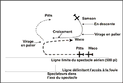 Le pilote du Waco est arrivé par la partie droite, à la poursuite du Pitts, le long de la ligne limite de 500 pieds (figure 4). Aux environs de l'axe du spectacle, il a fait un virage serré à 90° en éloignement des spectateurs pour suivre le Pitts. Toutefois, il était nettement derrière le Pitts. Puis il s'est fortement incliné à gauche et s'est mis en montée. Il a conservé une forte inclinaison, et l'avion a entrepris un virage à gauche, alors que l'on entend le bruit du réacteur qui augmente de puissance. Les enregistrements vidéo montrent que, dès le début de l'inclinaison à gauche, le pilote du Waco ne pouvait pas voir le Wolf-Samson. L'inclinaison a été maintenue jusqu'au moment de la collision. Comme dans le cas du pilote du Wolf-Samson, aucun message radio n'a été reçu du pilote du Waco, et il n'y a eu aucun mouvement de l'avion pouvant indiquer une tentative d'établir le contact visuel avec l'autre participant et pour assurer l'espacement.