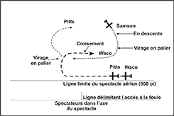 Les croisements des biplans étaient prévus de manière à offrir un espacement de sécurité qui était assuré visuellement grâce à des règles établies. Pour chaque ensemble de manoeuvres, les pilotes avaient un « contrat » établi. Dans la terminologie des spectacles aériens, un contrat est une entente conclue entre plusieurs pilotes qui précise comment chaque pilote va accomplir la manoeuvre et à quel pilote il revient d'établir l'espacement visuel. Un contrat comporte également une entente sur la façon d'interrompre une manoeuvre qui ne se passe pas comme prévu.