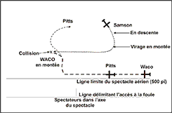 - Il y a eu perte de synchronisation de la manoeuvre lorsque le Waco a viré tardivement dans l'axe du spectacle.
