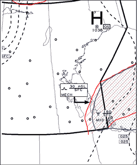 La carte du givrage et de la turbulence valide à 7 h décrivait de la turbulence mécanique modérée de la surface jusqu'à 3000 pieds agl sur le sud-est du Manitoba, y compris la région de Winnipeg. Cette carte faisait état de givre mixte modéré dans les nuages entre le niveau de congélation et 16 000 pieds asl sur le sud-est du Manitoba, la bordure ouest du givre prévu se situant juste à l'est de Winnipeg.