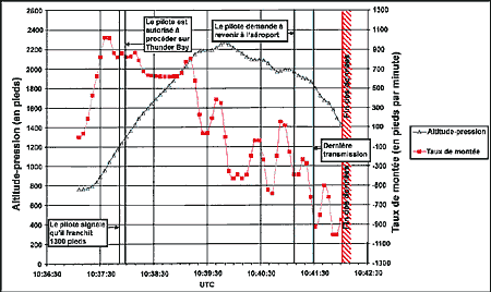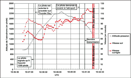 Pendant environ une minute, l'avion est monté sur le cap de la piste jusqu'à une altitude de 1300 pieds au-dessus du niveau de la mer (asl), soit 500 pieds au-dessus du sol (agl). Ayant été autorisé à monter à 9000 pieds asl et à procéder directement sur Thunder Bay, le pilote a tourné pour prendre le cap de sa destination. L'avion a poursuivi sa montée et a finalement atteint 2400 pieds asl environ deux minutes et demie après le décollage. L'avion a alors commencé à descendre progressivement à quelque 400 pieds par minute (pi/min) et s'est finalement retrouvé au-dessous de la couverture radar. L'accident s'est produit avant le lever du soleil, à 5 h 43. Le service d'incendie et de soins médicaux d'urgence de Winnipeg a été alerté et des pompiers d'un poste avoisinant sont intervenus.