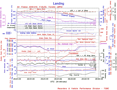 Le PF a commencé l'arrondi alors que l'avion se trouvait à quelque 40 pieds au-dessus de la piste. Entre ce point et le toucher des roues, il y a eu de nombreuses, et parfois importantes, corrections en tangage faites à partir du mini-manche latéral du PF, et l'avion est resté en palier à environ 25 pieds pendant 2½ secondes. Pendant ce temps, il y a également eu des corrections régulières, et parfois importantes, en roulis faites à partir du mini-manche latéral du PF. Mises ensemble, toutes ces corrections semblent vouloir indiquer que le PF était confronté à une charge de travail importante et devait faire preuve d'une attention soutenue pour maîtriser l'avion. L'équipage a amorcé une réduction progressive de la poussée à partir d'une N1 de 76 % alors que l'avion se trouvait à 50 pieds, les manettes des gaz atteignant la position de ralenti au moment où l'avion est arrivé à quelque 20 pieds au-dessus de la piste.