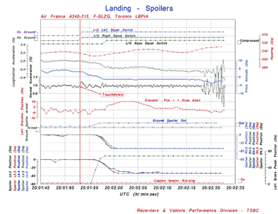 L'avion a touché des roues à 20 h 1 min 53 s à quelque 3800 pieds au-delà du seuil de la piste de 9000 pieds. Au moment de l'atterrissage, le train principal droit était légèrement à gauche de l'axe de piste, et l'avion était en crabe d'environ six degrés à droite. Les déporteurs sont sortis automatiquement, comme ils étaient censés le faire, après le toucher des roues du train principal avec la piste. L'équipage de conduite a immédiatement appuyé à fond sur les freins et a essayé d'aligner l'avion dans l'axe de piste. Le ralenti poussée inverse a été commandé 12,8 secondes après le toucher des roues du train principal, et l'inversion de poussée maximale a été commandée 16,4 secondes après le toucher des roues du train principal. Le PNF n'a pas fait les annonces standard de sortie des déporteurs et des inverseurs de poussée. L'avion n'a pas pu s'immobiliser sur la longueur de piste restante. Il est sorti en bout de piste à une vitesse sol d'environ 80 noeuds et a fini sa course dans un ravin. L'avion est sorti de la piste à 20 h 2 min 19 s.