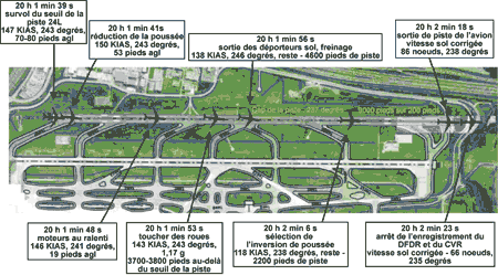 À 19 h 58, AFR358 se trouvait en approche finale à la vitesse d'approche. L'avion précédent avait fait savoir que le freinage était mauvais; les instruments de mesure du vent de la tour ne fonctionnaient pas, car ils avaient sauté pendant l'activité orageuse; les derniers renseignements disponibles à la tour faisaient état d'un vent du 230° à 7 noeuds; enfin, il y avait des éclairs tout autour de l'aéroport. Le mode de freinage automatique a été reconfiguré afin de le faire passer de basse à moyenne intensité, puis les instructions entourant les annonces à faire en cas de remise des gaz ont été passées en revue.