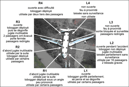 Le personnel navigant commercial (PNC) a ordonné l'évacuation dans les secondes qui ont suivi l'immobilisation de l'avion, alors que des flammes étaient visibles du côté gauche de l'appareil et que de la fumée pénétrait dans la cabine. Il n'y avait aucune alimentation électrique à bord d'AFR358 et les radios ne pouvaient pas fonctionner pour appeler la tour. Après avoir quitté son siège avec difficulté, le copilote a pris une lampe de poche et s'est rendu à l'arrière de l'avion en compagnie du chef de cabine principal et d'un des PNC afin de s'assurer qu'il n'y avait plus personne dans la cabine ou dans les toilettes. Ils sont ensuite retournés à l'avant de l'avion en empruntant l'autre ligne d'évacuation, pour confirmer que la cabine avait été entièrement évacuée, puis ils ont quitté l'avion par la porte L1, de laquelle ils ont dû sauter, car le toboggan ne s'était que partiellement déployé. Le copilote a été le dernier à sortir de l'avion.