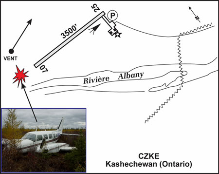Comme l'éclairage sur l'aire de trafic était mauvais, le commandant de bord s'est servi d'une frontale pour aider à charger et à mettre en marche l'avion. Une fois l'avion démarré, il a retiré sa frontale et s'est servi de l'éclairage de l'avion. La piste 25-07 de l'aéroport de Kashechewan a une longueur de 3500 pieds et elle est équipée d'un Système d'éclairage d'aérodrome télécommandé d'aéronef (ARCAL) de type K, de feux de bord de piste d'intensité moyenne ainsi que de feux de seuil et d'extrémité de piste. Tous les feux étaient allumés pour le décollage. Kashechewan se trouve dans une région inhospitalière, et l'aéroport se trouve au sud-ouest de la localité. Lorsqu'on décolle de nuit de la piste 25, les lumières de la localité ne sont pas visibles, et il y a peu ou pas de références visuelle au sol, surtout par une nuit obscure sans lune. Un vol dans un environnement qui s'apparente à un « trou noir » expose les pilotes à de plus grands risques d'illusion sensorielle.