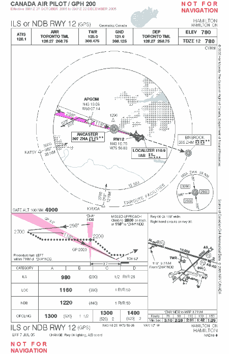 L'aéroport de Hamilton possède deux pistes en asphalte (voir l'annexe B). La piste en service, la piste 12, a une longueur de 10 000 pieds et une largeur de 200 pieds et son seuil est décalé de 1600 pieds, ce qui laissait une distance d'atterrissage disponible de 8400 pieds. L'annexe A montre les approches ILS ou NDB de la piste 12. La hauteur de décision et la visibilité recommandée pour cette approche étaient respectivement de 980 pieds au-dessus du niveau de la mer (asl) (200 pieds au-dessus du niveau du sol (agl)) et de ½ mille terrestre (sm). Le terrain situé au-delà de l'extrémité de la piste 12 est de niveau sur une longueur d'environ 25 pieds, puis il présente une pente descendante sur une distance d'environ 100 pieds avant de revenir de niveau dans une zone marécageuse.