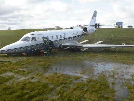 L'équipage de conduite aperçoit la piste à une hauteur comprise entre 400 et 500 pieds au-dessus du niveau du sol. Vers 19 h 2, heure normale de l'Est, l'avion se pose sur la piste mouillée à quelque 3000 pieds de l'extrémité. L'équipage de conduite utilise tous les dispositifs de freinage disponibles afin de ralentir l'avion. Néanmoins, l'appareil poursuit sa course après l'extrémité de piste et parcourt 122 pieds sur une pente descendante avant de s'immobiliser brusquement lorsque le train avant s'affaisse. L'avion est lourdement endommagé, mais aucun des deux membres de l'équipage de conduite n'est blessé pendant la sortie de piste. La radiobalise de repérage d'urgence se met en marche et les équipes de sauvetage et de lutte contre les incendies d'aéronefs interviennent.