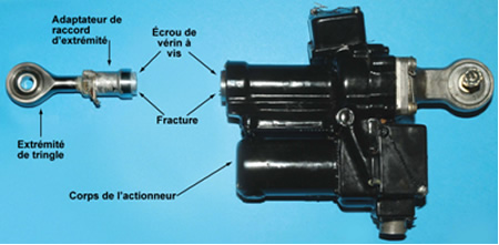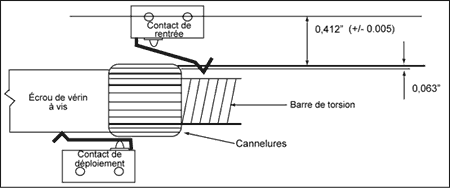 - Le non-actionnement du contact de fin de course de rentrée a amené l'adaptateur du raccord d'extrémité à faire contact avec la face de la barre de torsion, imposant ainsi une traction de plus de 1300 livres sur l'écrou du vérin à vis.