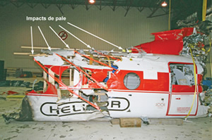 La reconstruction partielle des parties centrale et avant du fuselage indique clairement que les pales du rotor arrière ont pénétré dans la cabine, sectionnant des câbles de commande et l'arbre de synchronisation de l'hélicoptère. Une défaillance mécanique de l'actionneur de compensation de régime a déstabilisé l'assiette longitudinale du rotor arrière, et l'hélicoptère est devenu ingouvernable. Une fois que l'extrémité de tringle s'est séparée de l'actionneur de compensation de régime, la tête du rotor arrière est devenue instable, permettant au disque de ce rotor de s'incliner vers l'avant jusqu'à ce que les pales percutent le fuselage. Il est aussi possible dans ce type de défaillance que le disque du rotor arrière aurait pu s'incliner vers l'arrière. L'un ou l'autre scénarios ont des conséquences catastrophiques pour l'hélicoptère.