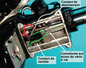 L'actionneur de compensation de régime comprend deux contacts de fin de course : une pour la rentrée, l'autre pour le déploiement (voir la figure 2). Ces contacts ont pour fonction de stopper le moteur électrique à la limite de rentrée ou de déploiement de l'actionneur. Les deux contacts de fin de course sont actionnés par des cannelures qui font partie intégrante de l'écrou du vérin à vis. Les contacts sont pourvus d'un bras qui s'appuie sur les cannelures. Lorsqu'il est suffisamment comprimé, le bras actionne un plongeur sur le contact et coupe le courant au moteur électrique.