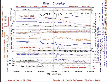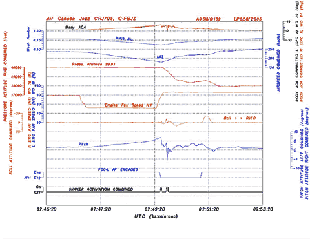 En prévision de la régulation du trafic à destination de Calgary, le commandant de bord, qui était le pilote aux commandes, a réduit la puissance afin de passer de la vitesse de croisière normale de 0,77 MNote de bas de page 3 à la vitesse en régime de croisière optimal de 0,70 M. Le directeur de vol était réglé en mode de contrôle automatique de l'altitude et le pilote automatique était embrayé. Le commandant de bord a ensuite concentré son attention sur le système de gestion de vol (FMS) sur la banquette centrale afin d'aider le copilote à déterminer les réserves de carburant pour une période d'attente possible. Quelque 90 secondes plus tard, le copilote a remarqué que la vitesse avait diminué à moins de 0,70 M et il en a avisé le commandant de bord. Ce dernier a réagi en poussant les manettes des gaz. L'avion a continué à décélérer en se cabrant davantage tout en demeurant au FL 400. Le commandant de bord a alors commencé à programmer une descente dans le mode vitesse verticale du calculateur de commandes de vol (FCC). Immédiatement après, la vitesse a diminué à 0,61 M (vitesse indiquée de 180 noeuds (KIAS)), le vibreur de manche s'est mis en marche et le pilote automatique s'est désembrayé. Les deux pilotes ont poussé le volant de commande vers l'avant pour diminuer l'assiette longitudinale, ce qui entraîné une descente et une augmentation de la vitesse. L'équipage a subséquemment redonné une assiette en tangage à l'avion, ce qui s'est traduit par une augmentation de l'angle d'attaque du fuselage et de la force d'accélération GNote de bas de page 4. Le vibreur de manche s'est de nouveau mis en marche 11 secondes après la première fois. Pendant ce temps, l'appareil subissait des tremblements et des oscillations dans l'axe de roulis de quelque 10 degrés. L'assiette en tangage a diminué davantage et la vitesse est revenue à 0,82 M (250 KIAS). L'altitude s'est brièvement stabilisée au FL 386 avant que l'équipage, en coordination avec l'ATC, poursuive la descente jusqu'au FL 380 à cause d'un conflit de trafic. (Voir les tracés de l'enregistreur numérique de données de vol aux annexes A et B.)
