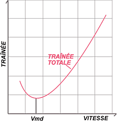 La vitesse de traînée minimale (Vmd) est définie comme étant la vitesse à laquelle la traînée totale de l'aéronef est la plus faible et pour laquelle il faut le moins de poussée pour maintenir le vol en palier. Cette vitesse est reliée à la vitesse d'endurance. À une altitude constante, une réduction progressive de la vitesse vraie sous la Vmd entraîne une augmentation concomitante de la traînée totale, ce qui fait diminuer encore plus la vitesse. Par conséquent, les valeurs de vitesse inférieures à la Vmd peuvent entraîner une stabilité négative (voir la figure 1). Lorsque la vitesse de croisière devient inférieure à la Vmd, on peut rétablir la vitesse en augmentant la puissance des moteurs, en amorçant une descente, ou en combinant les deux.