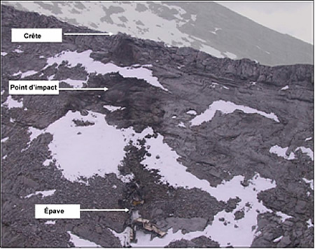 La plus grande partie de l'épave s'est retrouvée sur un talus d'éboulis pentu à environ 100 pieds sous le point d'impact. De petits morceaux d'épave ont été retrouvés de l'autre côté de la crête. Un incendie après impact, alimenté par le carburant, a consumé la plus grande partie de l'avion. Le pilote a été retrouvé avec l'épave, et le passager, 500 pieds plus bas. L'hélice n'a pas été retrouvée; par contre, un examen du vilebrequin du moteur a indiqué que le moteur développait une certaine puissance au moment de l'impact. Il y avait un relief plus élevé un mille plus loin sur le prolongement de la trajectoire de l'avion, au-delà de la crête (voir la Photo 1).