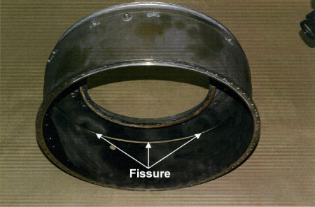 Sur le carter de la chambre de combustion en question, il y avait une soudure de réparation antérieure sur le renfort, et la soudure avait été polie et finie de manière à être à peu près indécelable. Une extrémité de la fissure se terminait à cette soudure. On a déterminé que la soudure n'avait rien eu à voir dans l'amorce de la fissure; en fait, la soudure avait stoppé la fissure.