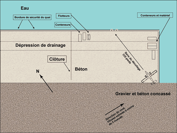 Le quai à surface de béton est orienté nord-ouest sud-est (voir l'Annexe A). Il y a une clôture à mailles métalliques au milieu du quai qui court perpendiculairement au bord du quai. Il y a aussi une bordure de sécurité en bois de 14 pouces de hauteur, constituée de poutres en bois mesurant 12 pouces de côté, entourant le périmètre extérieur du quai. À environ 105 pieds du côté eau, dans le sens du décollage, il y a une dépression mesurant environ 60 pieds de largeur sur 1,5 pied de profondeur à la surface du quai, et elle se prolonge parallèlement au bord ou à 45° par rapport au sens du décollage.