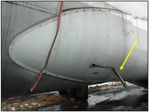 Lorsque la porte de soute est ouverte, la poignée est sortie vers l'extérieur à environ 90 degrés, dans l'écoulement aérodynamique (voir la photo 3). Boeing et le National Transportation Safety Board des États-Unis avaient déjà examiné la poignée extérieure de porte de soute à la suite d'un incident semblable. L'analyse avait permis de conclure que, à une vitesse de 190 nœuds, la force aérodynamique poussait la poignée assez loin pour que la tension du ressort intérieur de la porte de soute rentre complètement la poignée, même si la porte de soute demeurait ouverte. Durant le vol en question, l'avion a atteint une vitesse indiquée maximale de plus de 250 nœuds.