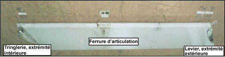 La tringlerie intérieure s'était rompue en surcharge, le levier extérieur avait été déformé et le roulement à billes reliant ce levier au volet avait été arraché du levier. Les bagues du levier du tab du volet extérieur droit présentaient une usure excessive davantage prononcée que celle du levier de gauche.