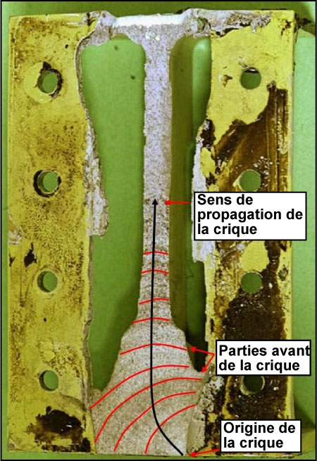 Avant cet incident, on n'avait remarqué ni dans les vols antérieurs ni dans les antécédents de service aucune anomalie indiquant l'existence d'un problème quelconque relativement à la ferrure d'articulation. Cette dernière s'est rompue en raison d'une fatigue oligocyclique, laquelle a débuté à l'endroit où on a identifié les dommages dus à l'impact. Ces derniers ont créé une concentration de contraintes qui s'est transformée en une crique de fatigue au cours de la durée de vie en service de la ferrure d'articulation. On a repéré les dommages dus à l'impact dans une région qui est cachée une fois la ferrure installée. Il est probable que la ferrure d'articulation a été endommagée avant ou pendant l'installation et, étant donné l'étendue relativement faible des dommages qu'elle a subis, que l'on n'a alors pas remarqué ces dommages. Après l'installation, il aurait été impossible d'observer ces dommages, et il aurait été très difficile de déceler la crique dans le cadre d'inspections ultérieures.