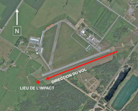L'impact initial s'est produit à 460 pieds au sud-ouest de l'extrémité de la piste 10. L'avion a glissé sur 23 pieds et s'est immobilisé à un cap approximatif de 200° magnétiques (voir l'annexe A). L'avion a percuté le sol dans un piqué peu prononcé et l'aile gauche légèrement basse. Les traces au sol montraient que le train d'atterrissage était sorti et que les deux ailes se sont séparées de l'avion au moment de l'impact. Lorsque l'avion a été examiné sur les lieux, aucune anomalie n'a été constatée au niveau des circuits de commande des ailerons, de la direction et de la profondeur.
