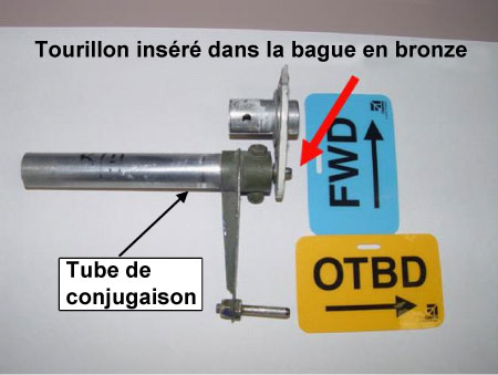 Au moment de la pose des ailes, il faut s'assurer que le tourillon à l'extrémité extérieure du tube de conjugaison des volets est bien positionné dans la bague en bronze sur le bras d'articulation des volets (voir la Photo 1). Il faut inspecter visuellement le tourillon à partir du dessous de l'avion pour vérifier que le tout a été monté correctement. Comme vérification complémentaire du montage, les volets devraient être sortis et rentrés au moyen des commandes du poste de pilotage.