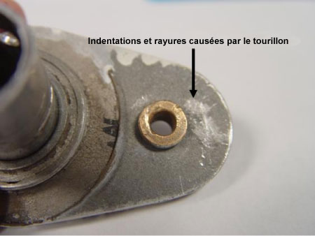 L'examen détaillé du bras d'articulation de l'ensemble du volet droit a permis de constater des indentations et des craquelures sur la bague de bronze. Il y avait des rayures circulaires et des traces de frottement sur la surface adjacente à la bague. Ces traces semblaient avoir été faites récemment et correspondaient à des dommages pouvant se produire pendant le mouvement des volets. La taille et le rayon des indentations correspondaient à celles du tourillon installé à l'extrémité du tube de conjugaison de la commande des volets. Le rayon des frottements et des rayures circulaires correspondait au rayon du tube de conjugaison de la commande des volets. Le frottement indiquait que le tube de conjugaison s'était déplacé vers le haut et vers l'arrière, autour de la bague de bronze (voir la Photo 2).