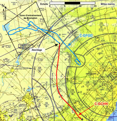 Les données radar indiquent que le C-GFGD effectuait une descente graduelle de 3800 à 2400 pieds sur un cap sud-est en direction de l'aéroport de Brampton, tandis que le C-GCHN se dirigeait au nord vers Collingwood en maintenant une altitude de 2400 pieds. Les deux avions convergeaient selon un angle de 120° et se rapprochaient à une vitesse d'environ 200 noeuds (340 pieds/seconde). Les trajectoires de vol et la géométrie de la collision sont représentées aux annexes A et B. Les avions présentaient un angle de 30° l'un par rapport à l'autre.