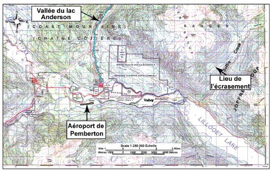 Le laboratoire technique du BST a effectué une analyse de l'ombre du relief (Rapport LP 065/2006 du laboratoire technique du BST ). Les lieux de l'accident se situent dans un rétrécissement de la section de montée initiale où la vallée mesure environ un mille de largeur. Au moment de l'accident, les lieux se trouvaient dans un grand secteur ombragé, du côté gauche de la vallée (pente face au sud-est), d'où le soleil avait disparu depuis quelques heures. La hauteur des crêtes de montagne près des lieux de l'accident varie de 9150 pieds à 8550 pieds asl, et certaines des crêtes les plus élevées étaient couvertes de neige. Les coordonnées de l'endroit où se trouvait l'épave, 50° 20' de latitude N et 122° 34' de longitude O, correspondent à une altitude d'environ 3280 pieds asl.