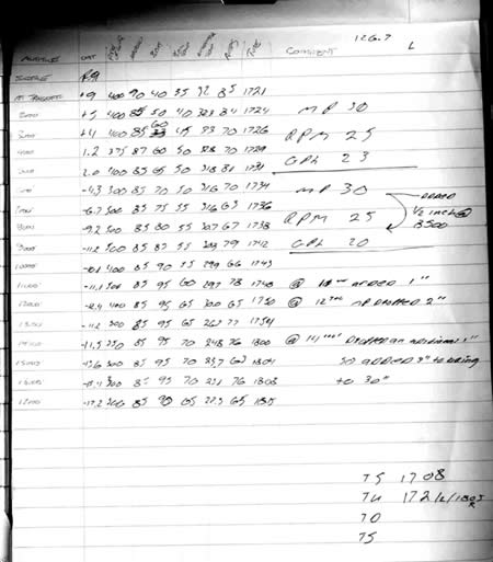 | 14000 | −11,5 | 350 | 85 | 95 | 70 | 24,8 | 76 | 18 h 00 | @ 14,000 [PA] baisse de 1 po additionnel, alors ajout de 3 po pour atteindre 30 po |