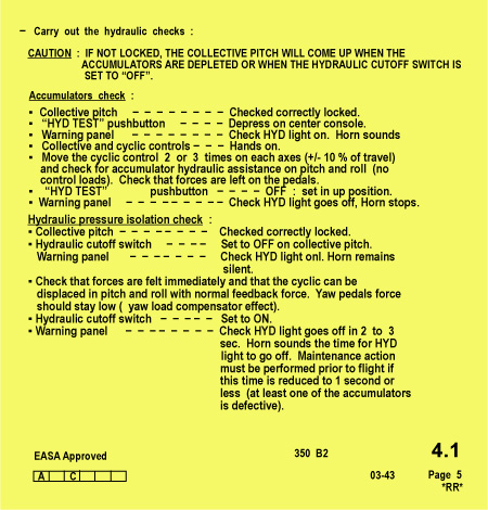 Les procédures relatives à l'essai hydraulique avant vol prescrites dans le manuel de vol du giravion Eurocopter AS 350 B2, RR 3a, page 5 (voir la page ci-contre) précisent qu'il devrait y avoir deux ou trois mouvements du manche de pas cyclique avant que ne s'épuise le liquide hydraulique sous pression de l'accumulateur. L'essai de l'accumulateur se fait au sol au régime de vol normal du rotor, c'est-à-dire, à au moins 375 tr/min, verrou de levier de pas collectif engagé. En résumé, l'essai demande que le pilote règle le commutateur d'essai hydraulique sur HYD TEST et qu'il déplace le manche de pas cyclique deux ou trois fois pour vérifier qu'il y a bel et bien assistance hydraulique sur les axes de tangage et de roulis. Le pilote règle ensuite le commutateur sur la position normale OFF. À la fin de cet essai d'isolement hydraulique, le pilote vérifie que les accumulateurs se rechargent en deux ou trois secondes, mais pas plus rapidement qu'en une seconde. Un intervalle d'une seconde ou moins indique qu'au moins un des accumulateurs est défectueux.