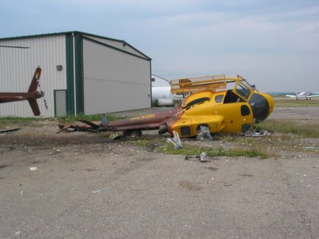 L'hélicoptère a rapidement dérivé vers l'arrière, hors de l'aire de trafic asphaltée, a pivoté d'environ 90° sur la gauche, et le sabot de queue de la contre-dérive a heurté le sol et labouré la surface en gravier se trouvant alors au-dessous. L'hélicoptère a glissé vers l'arrière et a basculé sur la droite, et les patins d'atterrissage ainsi que pales du rotor principal ont percuté le sol. À la suite de ce lourd contact avec le sol, l'hélicoptère a basculé sur le côté droit. La tête de rotor et les pales du rotor principal ont été détruites, les pales éclatant en morceaux pour être projetées sur une grande surface. Au même moment, la partie arrière de la poutre de queue s'est rompue près du point de fixation avant du stabilisateur, et le rotor de queue a été arraché de l'extrémité de la poutre de queue.
