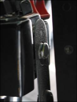 Un examen préliminaire de la plaque de verrouillage de C-GBHH montre effectivement de l'usure, mais il montre aussi des signes évidents d'engagement incorrect du verrou (voir la Photo 3). De par sa conception, la plaque de verrouillage s'engage sur le bouton de verrouillage du levier de pas collectif dans une gorge usinée servant à immobiliser la plaque de verrouillage faite d'acier à ressort. La plaque est dégagée lorsqu'on abaisse le levier de pas collectif, ce qui permet à la plaque de se dégager de la gorge et de sauter vers l'avant, à l'écart du bouton de verrouillage. Dans des essais pratiques, cette simple fonction était réalisée sans anicroche lorsque la plaque s'engageait correctement dans la gorge.