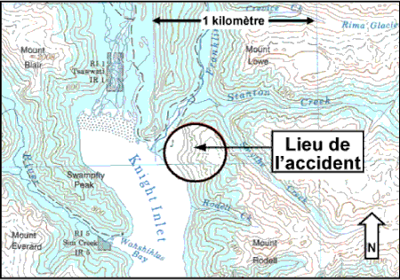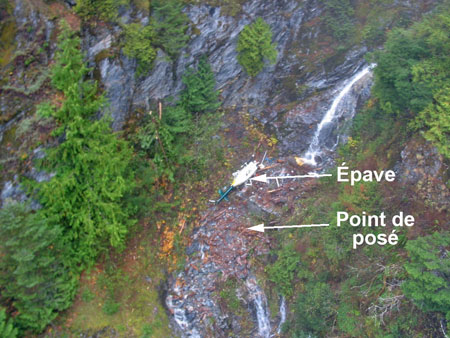 L'hélicoptère subit des dommages importants, mais aucun incendie ne se déclare après l'impact. L'accident a lieu par 51° 4′ 24″ de latitude nord et 125° 32′ 37″ de longitude ouest, à une altitude de quelque 1350 pieds.