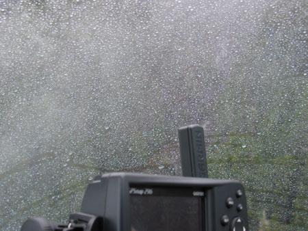 Dans de la pluie, une limite additionnelle vient nuire à la vision du pilote d'un Bell 206, car cet hélicoptère n'est pas équipé d'essuie-glace de pare-brise. Lorsque l'hélicoptère vole vers l'avant, la pluie qui tombe sur le pare-brise s'écoule de ce dernier en perlant un peu. Cependant, lorsque la vitesse vers l'avant de l'hélicoptère est faible et, en particulier en stationnaire, l'écoulement aérodynamique au-dessus du pare-brise est réduit, et de l'eau peut s'accumuler sur ce dernier et réduire la visibilité de façon importante. La photo 4 illustre la visibilité vers l'avant à partir du poste de pilotage d'un Bell 206, à faible vitesse vers l'avant, dans de la pluie d'intensité moyenne.