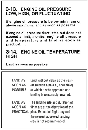 La section 3-13 du manuel de vol de Bell Helicopter (voir figure 2) stipule que dans le cas où la pression d'huile moteur passe sous le minimum ou au-dessus du maximum, le pilote doit atterrir aussitôt que possible, c'est à dire qu'il est recommandé d'atterrir sans délai, sur l'aire d'atterrissage convenable la plus proche, qui permet une approche et un atterrissage en toute sécurité.