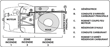 La liste de vérifications incendie moteur (voir l'Annexe A) contenait les étapes à suivre pour arrêter le moteur, fermer les robinets coupe-feu pour interrompre l'alimentation en carburant, en huile et en liquides hydrauliques au moteur, et décharger les extincteurs à CO2 dans les zones 2 (section des accessoires moteur) et 3 (section fuseau-moteur). La fermeture du robinet coupe-feu n'a pas eu d'effet sur l'alimentation en carburant dans la zone 3 parce que le feu avait touché la conduite de carburant entre le réservoir et le robinet coupe-feu (voir la Figure 1).
