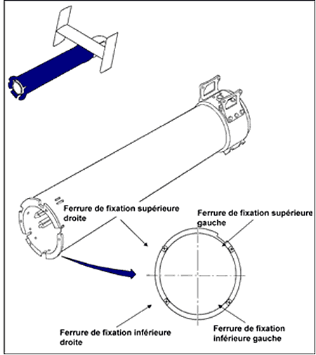 Les quatre ferrures de fixation étaient montées sur le couple arrière du fuselage, lequel transmet les charges de la poutre-fuselage aux longerons de la cellule principale. Les écrous de blocage sont conçus pour permettre de déposer de façon répétée les boulons de fixation sans compromettre la capacité de blocage des écrous.