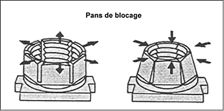Le boulon de fixation supérieur gauche avait été arraché de l'écrou de blocage. Les filets du boulon et de l'écrou de blocage montraient des dommages correspondant à un mouvement de cisaillement. Le boulon de fixation supérieur gauche était complètement vissé dans l'écrou et il dépassait de celui-ci de trois ou de quatre filets. L'écrou de blocage était composé de six pans flexibles (voir les pans de blocage à la Figure 3) qui assuraient le blocage à mesure que le boulon était vissé. Un des six pans était brisé, et un deuxième était criqué mais toujours en place; il s'est brisé à la suite d'une légère pression du doigt. Un troisième pan présentait plusieurs petites criques émanant de la surface intérieure. Des fissures étaient visibles sur les trois pans à partir des fonds de filets intérieurs et se propageaient aux coins formés par l'intersection des filets avec découpes verticales. Le Laboratoire technique du BST a confirmé que les criques avaient été causées par de la fatigue. Les surfaces exposées des criques présentaient des marques de frottement, lesquelles ont détruit tout détail fin sur la nature de la fatigue.