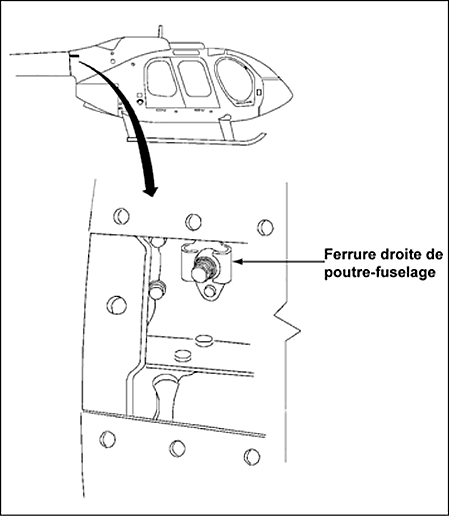 La poutre-fuselage de l'hélicoptère était fixée au fuselage en quatre endroits au moyen de deux boulons d'un diamètre de 5/16 pouce dans les parties supérieure droite et inférieure gauche et par deux boulons d'un diamètre de 3/8 pouce dans les parties supérieure gauche et inférieure droite (voir la Figure 2).