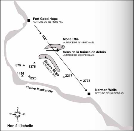 Le lieu de l'écrasement a été localisé à 3 nm environ à l'est de la route directe entre Fort Good Hope et Norman Wells. La traînée de débris d'une longeur de 60 pieds était parallèle au versant sud du mont Effie. Elle était orientée au cap magnétique de 50° à une altitude de 2000 pieds asl. L'avion est descendu en présentant une assiette en cabré d'environ 20° et, par conséquent, l'hélice arrière a heurté le sol en premier. La partie inférieure du fuselage a ensuite absorbé la majeure partie de la force de l'impact, ce qui a comprimé la cabine passagers à une hauteur de deux pieds. L'hélice avant s'est rompue au niveau du flasque moteur. Les extrémités des pales avaient subi des dommages qui indiquaient que le moteur tournait au moment de l'impact. Les deux moteurs tournaient au moment de l'accident.